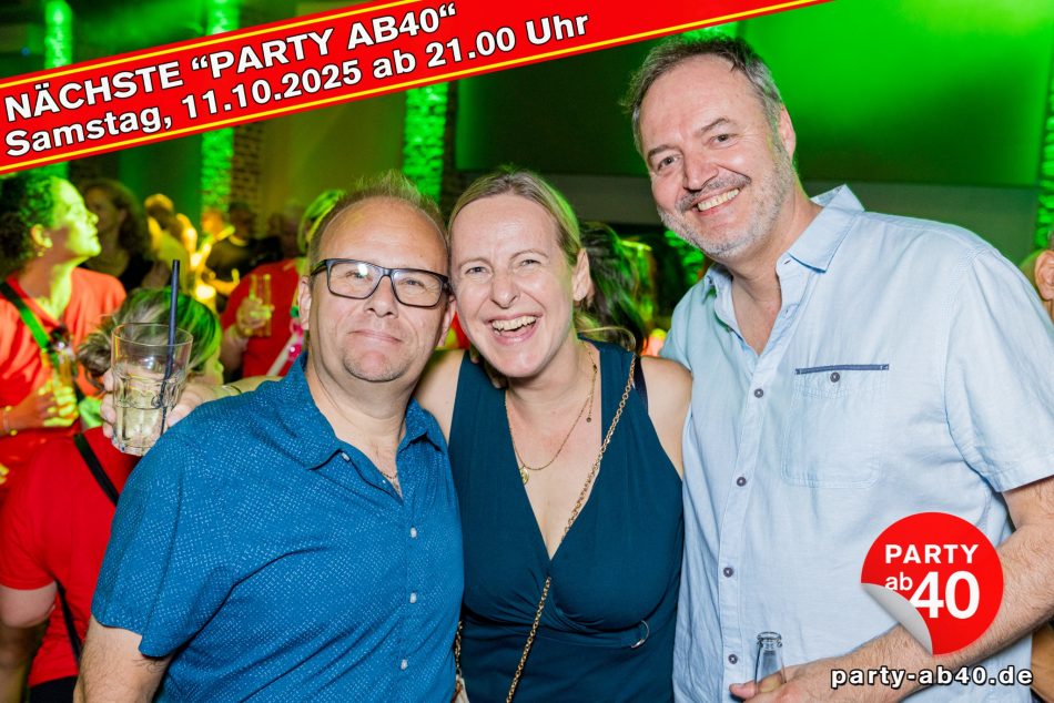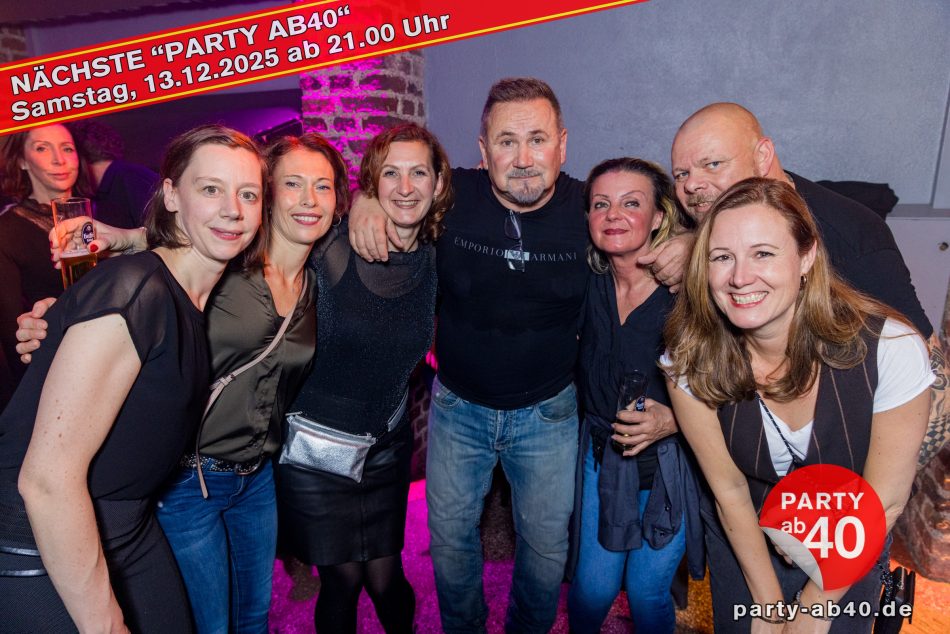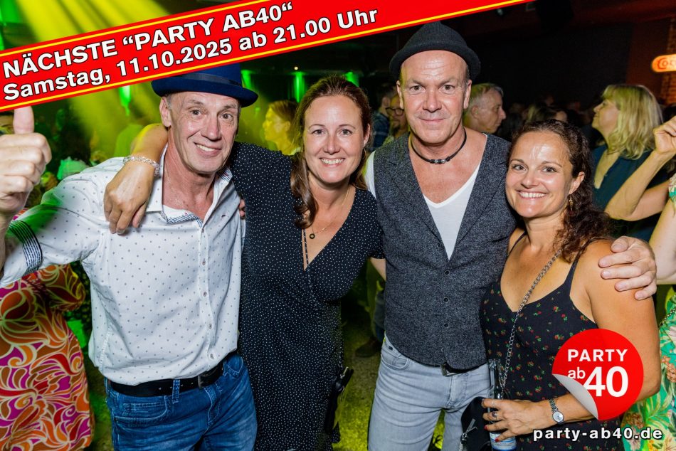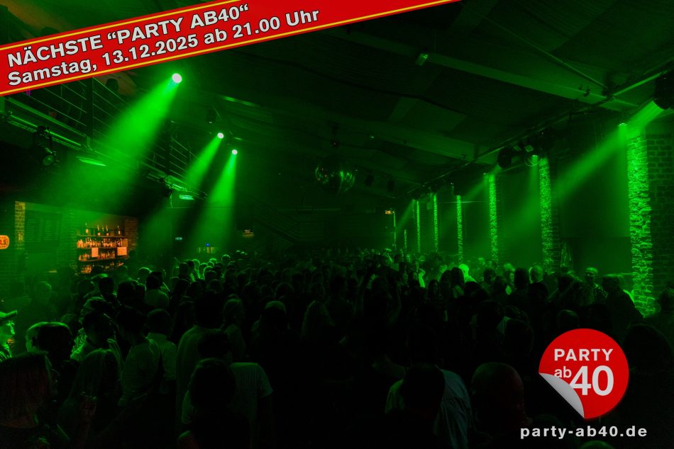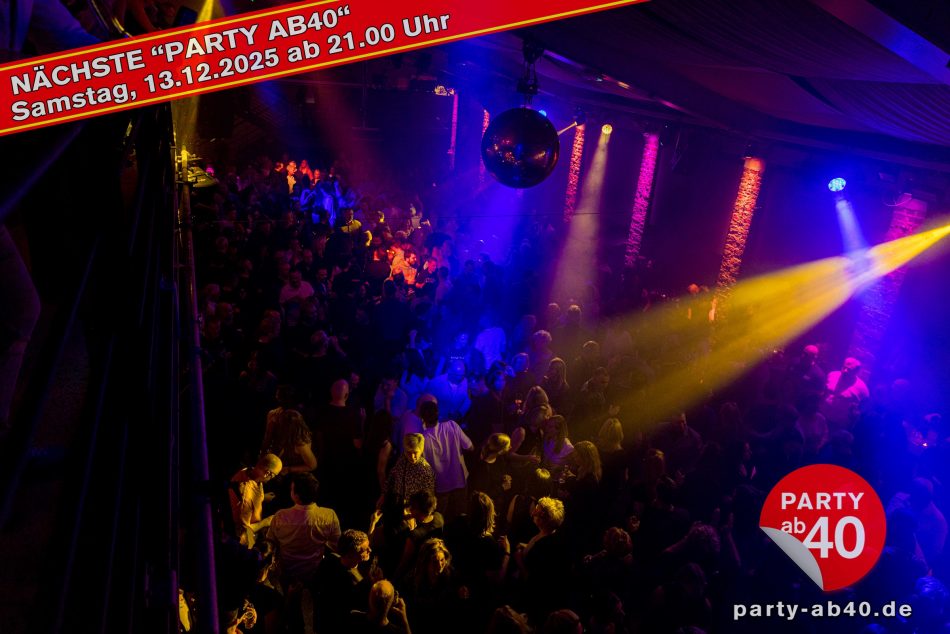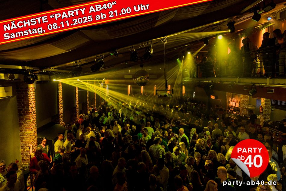 „PARTY AB40“ die Ü40-Party in Köln, welche wie kaum eine andere für ein gemeinsames Gefühl oder Gemeinschaft steht. Rückblicke in die gute alte Zeit, aber immer mit einem Feingefühl für den Puls der Zeit. Neue Freunde kennenlernen oder Altbekannte wiedertreffen, auf Kölns größter Ü40 Party.