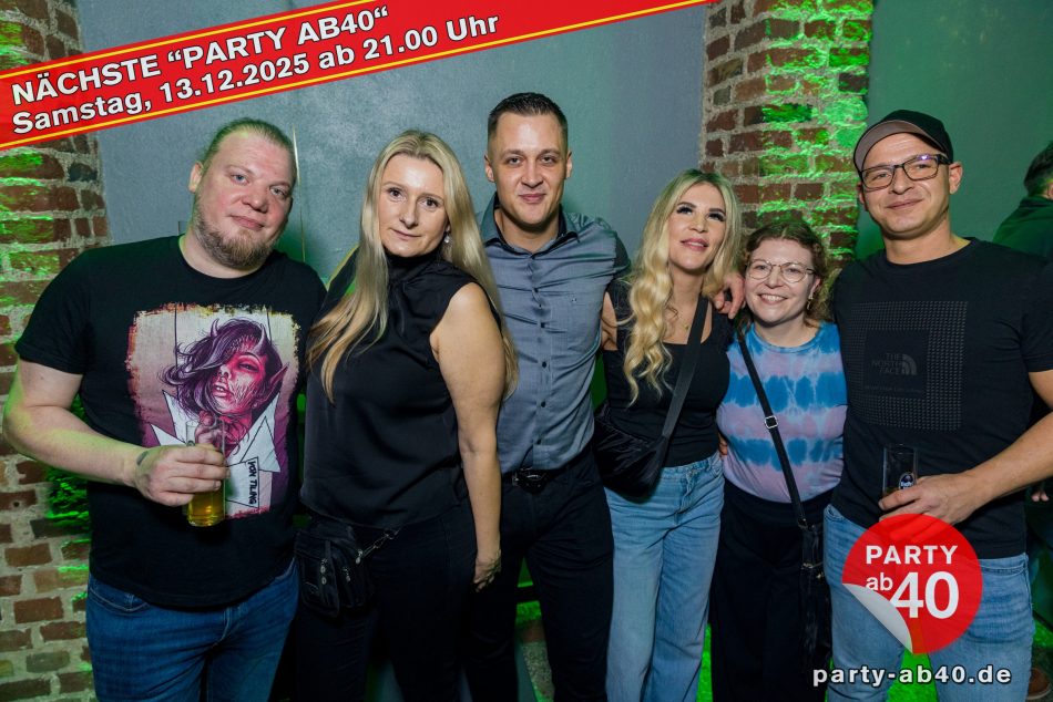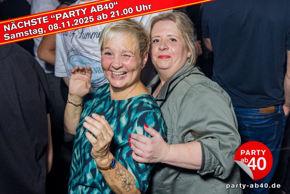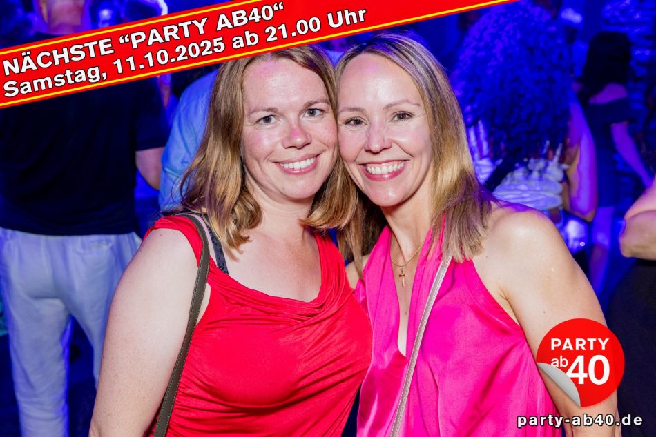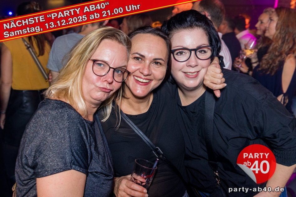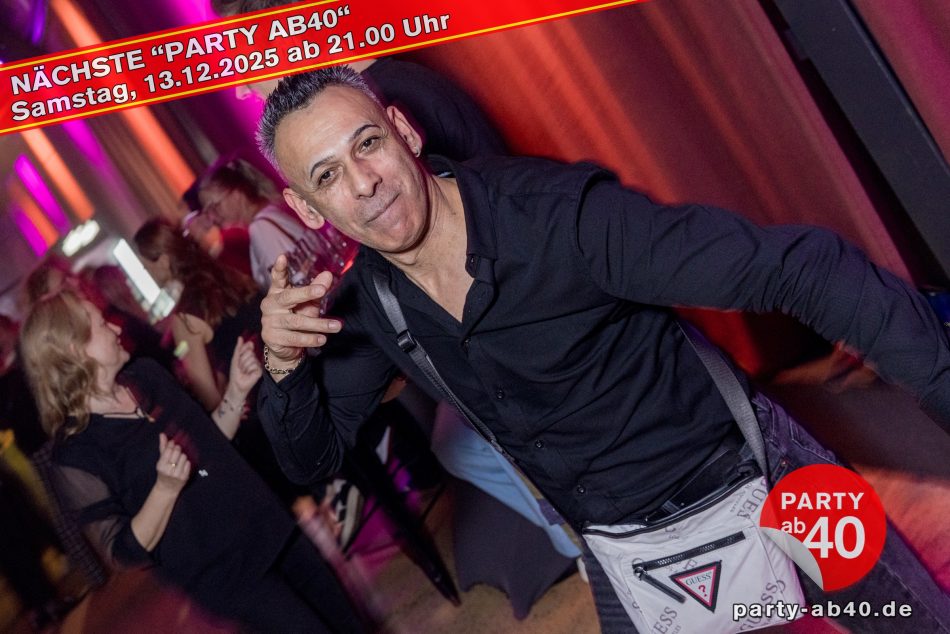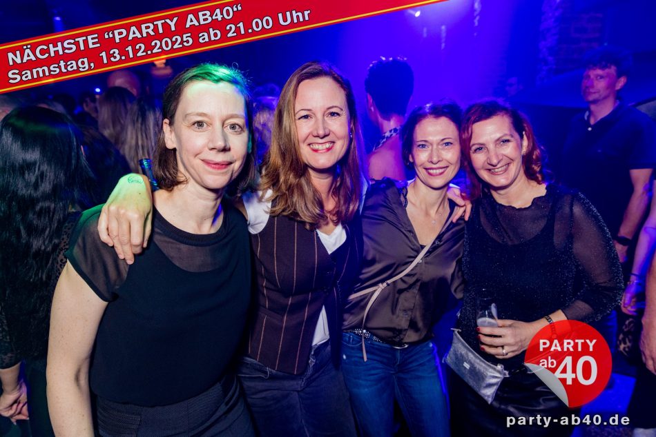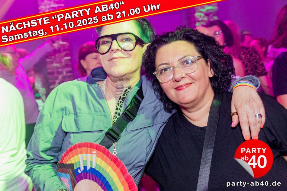 „PARTY AB40“ die Ü40-Party in Köln, welche wie kaum eine andere für ein gemeinsames Gefühl oder Gemeinschaft steht. Rückblicke in die gute alte Zeit, aber immer mit einem Feingefühl für den Puls der Zeit. Neue Freunde kennenlernen oder Altbekannte wiedertreffen, auf Kölns größter Ü40 Party.